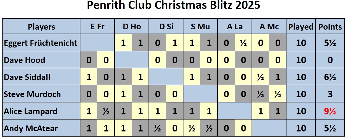 As is customary on our final club meeting of the year, we held our Christmas Blitz competition. This year, as last, was to be a double round robin with an entry fee of £1 – winner take all. The time control was, a blistering, 3 minutes with 2 seconds increment per move.