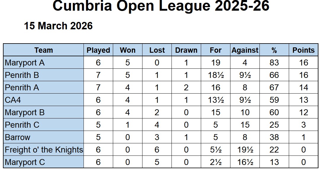 Our A team is now just 2 points behind leaders Maryport A and Penrith B. See the table below: