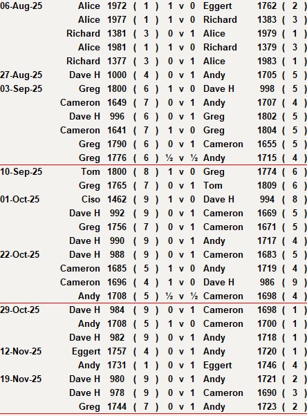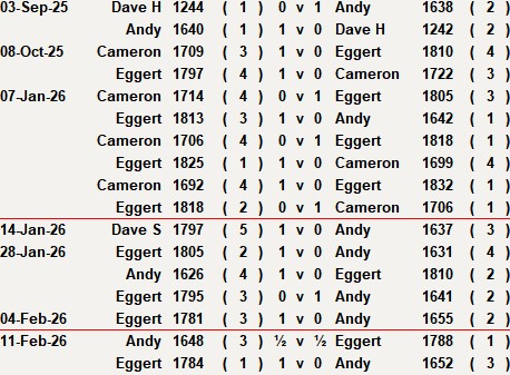 Eggert joined Alice and Cameron on 2 match points after beating Dave H. Dave managed to draw the first game but went on to lose the next two.