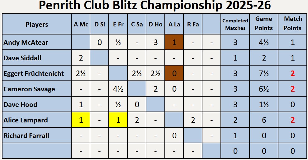 The Blitz Championship is, as the name suggests, a blitz (all the moves in 10 minutes or less) all play all competition. As some struggled to set the clock, the time control going forward, is anything less than 10 minutes per game. Each match must be won by 2 games in order to pick up 1 match point. As some matches can last many games, they need not be finished in one session, colours are recorded, along with the score, so that adjourned matches can continue where they left off.