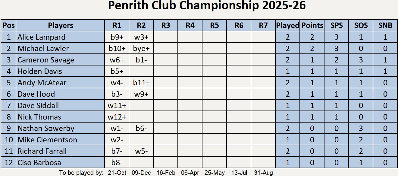 The Penrith Club Knockout is, as the title says, a knockout competition played at 1 hour each on the clock. The winner will progress to the next round, the loser is knocked out of the competiton. If the game is drawn, then you will play another game with colours reversed and if that game is a draw, there will be 30 minute rapidplay games, again with colours reversed. If after the rapidplay there is no winner after two games, an ‘Armageddon’ game (6 minutes for white and 5 minutes for black but black need only draw to win the game) will be played with colours decided at random. So, bear in mind the possibility of several games to be played by the deadline and contact your opponent early.