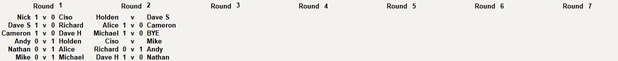 Alice won the replay against Dave S to proceed to round 2, where she will face either Michael or Dave H. We also have our first semi-finalist, Cameron won his game against Mike and will play the winner of the match between Richard and Lewis.