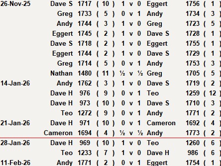 Two result this week. Eggert held on to the top rung with a draw and a win against Andy.