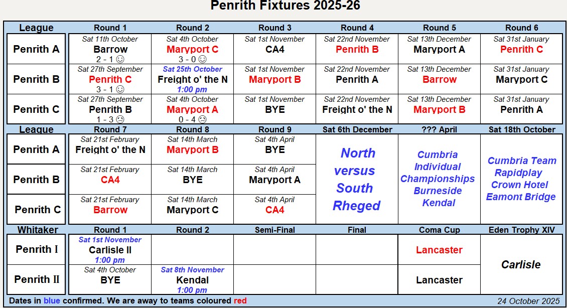 Penrith Chess Club currently runs three teams in the Cumbria Open League, though we have had as many as four. We also usually enter two teams in the Whitaker Handicap Trophy and from time to time, the Northern Counties Chess Union Competition.