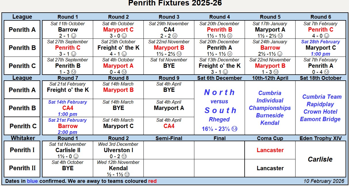 Penrith Chess Club currently runs three teams in the Cumbria Open League, though we have had as many as four. We also usually enter two teams in the Whitaker Handicap Trophy and from time to time, the Northern Counties Chess Union Competition.